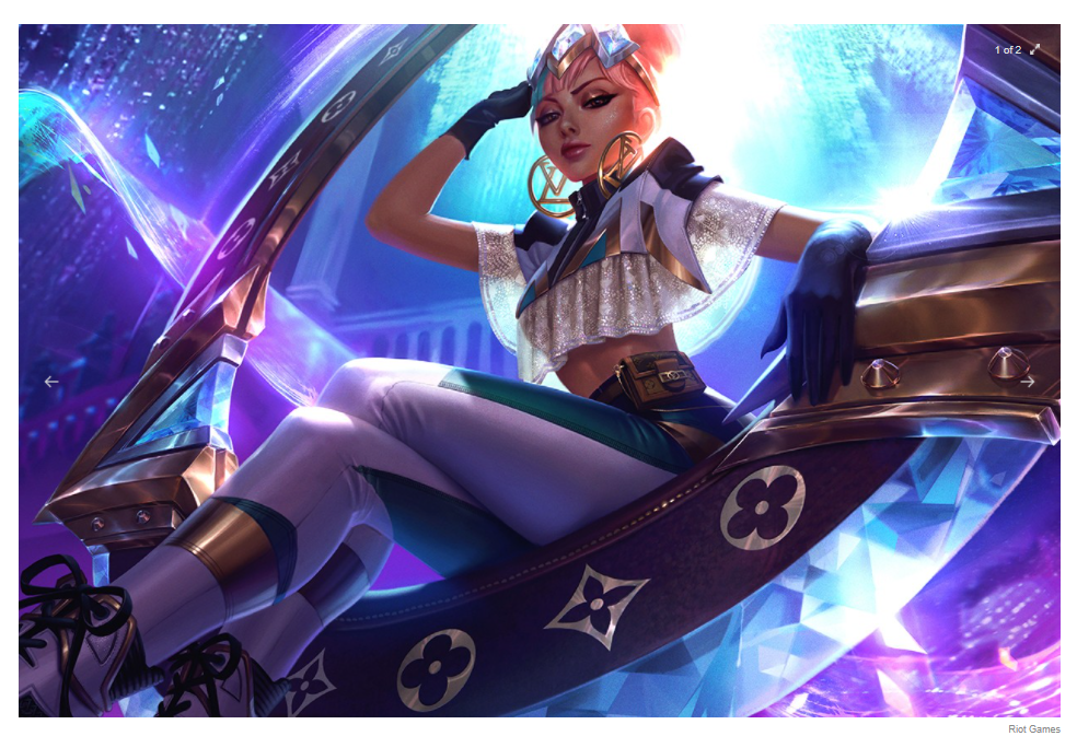 LoL 내에서 사용하는 게임 스킨에 루이비통 문양을 넣어주었는데요. 게임내에서 내 캐릭터에게 루이비통 옷을 입히려면 10달러를 주고 루이비통 스킨 구매할 수 있습니다. 루이비통 의상 아이템 판매 수입보다 LOL 이용자 800만명에게 브랜드를 접점을 확대하고 좀더 영한 루이비통의 브랜드 이미지를 각인하려는 시도로 보입니다.