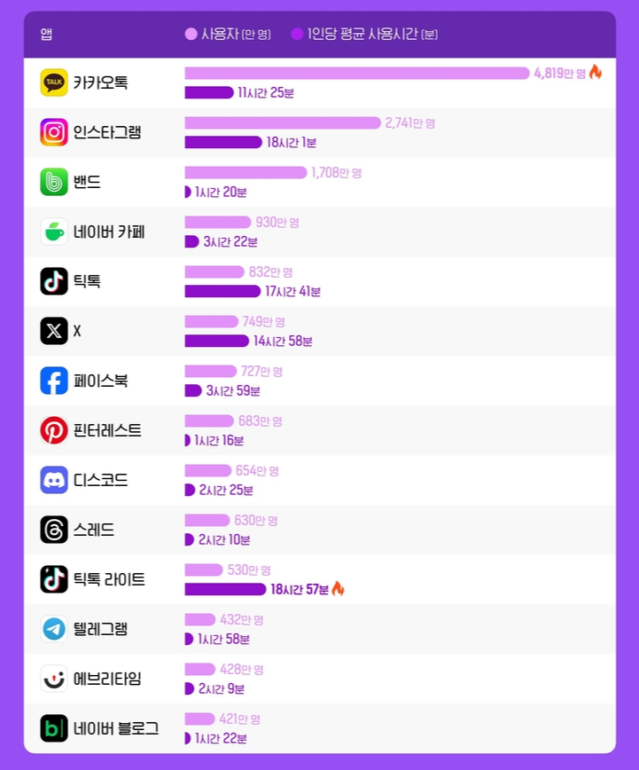 앱 결제 데이터 기반 시장 분석 솔루션 '와이즈앱 리테일'이 패널을 통한 통계적 추정으로 5천 120만명을 조사한 결과에 따르면, 지난 8월 월간 활성 이용자(MAU)는 카카오톡이 4천819만명으로 가장 많았지만, 1인당 사용시간 순위는 틱톡 라이트가 1위로 1인당 평균 18시간 57분을 이용했고, 다음으로 인스타그램 18시간 1분으로 집계되었습니다.